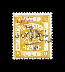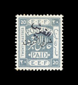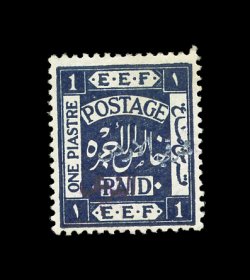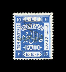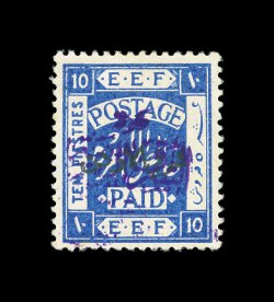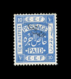 290 og imageS.G. #35, 1922 (Nov.) 10Pi on 10Pi Ultramarine, surcharged on stamp of Palestine, strong color, o.g., very fine; an extraordinarily rare stamp, with less than 100 examples of this stamp and the 20P combined having been printed; 1991 BPA certificate (Scott #28; $1,750.00). (Image) £1,800