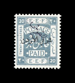 291 og imageS.G. #36, 1922 (Nov.) 20Pi on 20Pi Pale grey, surcharged on stamp of Palestine, uncommonly well centered, o.g., lightly hinged, very fine; an especially handsome example of this rare stamp that is almost never offered at auction; signed H. Bloch and accompanied by a 1996 Brandon certificate; ex-Asch (Scott #29; $2,250.00). (Image) £2,500