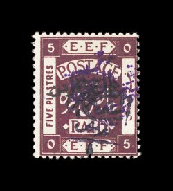 299 og imageS.G. #83b, 1923 (April-Oct.) 1Pi on 5Pi Deep purple, on December 1922 overprint in violet, centered to the right as always on this stamp, deep color, o.g., lightly hinged, very fine for this; only 20 examples have been recorded;Q< 1996 Brandon certificate (Scott #89; $1,900.00). (Image) £2,000
