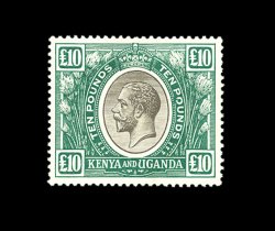 306 og imageS.G. #100, 1922 £10 Black and green, a select premium quality example of this important high value, boasting exceptionally deep strong colors and razor-sharp impressions, wonderfully well centered and possessing excellent overall freshness, o.g., lightly hinged, extremely fine and remarkably attractive; 1989 BPA certificate (Scott 41A; $8,000.00). (Image) £7,500