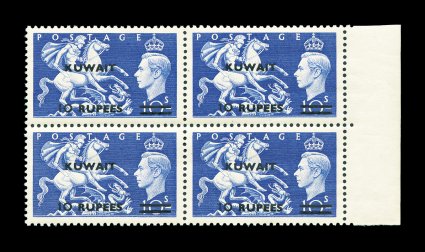 312 nhbl imageS.G. #92a, 1952 10R on 10/- Ultramarine, Ty. II overprint, right sheet-margin mint block of four, flawless centering, brilliantly fresh, o.g., n.h., (trivial small offset on gum of top right stamp), extremely fine and a choice block (Scott #101 var.). (Image) £900+