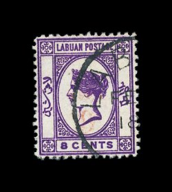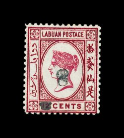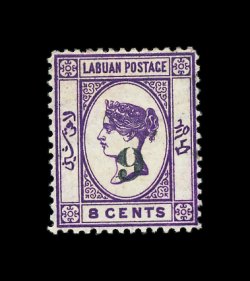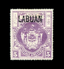 332 ng imageS.G. #141, 1905 $5.00 Bright purple overprinted "LABUAN", a highly desirable unused example of this rarity, without gum as are nearly all known examples, especially bright and fresh, excellent centering, very fine; a stamp that rarely makes its way onto the auction block; 1993 BPA certificate (Scott #122; $4,750.00). (Image) £5,500