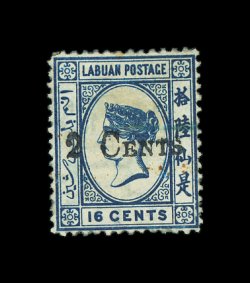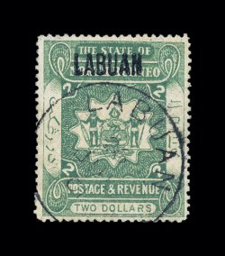 331 O imageS.G. #140, 1904 $2.00 Dull green overprinted "LABUAN", postally used, with light c.d.s. postmark, well centered, a very fine example of this rare stamp; 1937 BPA certificate (Scott #121; $2,750.00). (Image) £2,750