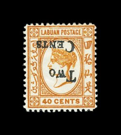 325 og imageS.G. #49a, 1892 "TWO CENTS" surcharge on 40c Ochre, inverted surcharge, pos. 4, rich luxuriant color, o.g., h.r., very fine; 1991 BPA certificate (Scott #40a; $425.00). (Image) £375