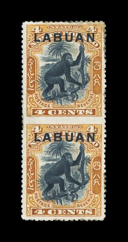 328 og imageS.G. #112a, 1900 4c Black and yellow brown, vertical pair, imperforate between, nicely centered, rich color, slightly disturbed o.g., some perfs. affected by light gum soaking, very fine appearance; a truly elusive variety (Scott #96a; $800.00). (Image) £900
