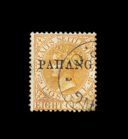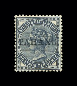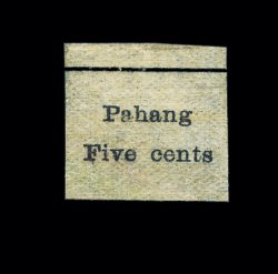 365 og imageS.G. #27, 1898 "Pahang/Five cents" and bars on interleaving paper, unused, without gum as issued, fresh, very faint horizontal crease, otherwise very fine; a very scarce provisional which was proposed for the 5c rate that never materialized; 1994 BPA certificate (Scott #27; $900.00). (Image) £1,800