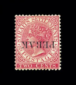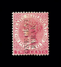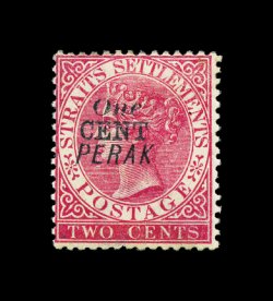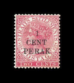 368 ng imageS.G. #30a, 1887 "ONE CENT/PERAK" on 2c Rose, black overprint, unused, attractive color, small surface scrape at right, fine appearance; signed Stanley Gibbons and accompanied by a 1954 BPA certificate (Scott #15A; $1,250.00). (Image) £1,700