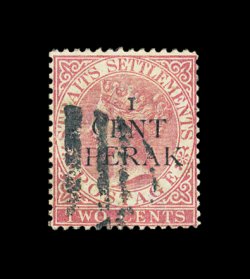370 O imageS.G. #31, 1887 "1 CENT PERAK" Ty. 28 surcharge on 2c Pale rose, used, fresh color, partially reperforated at left, fine appearance; 1996 BPA certificate (Scott #18A; $325.00). (Image) £500