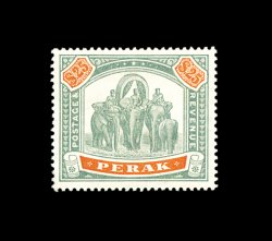 369 og imageS.G. #31, 1887 "1 CENT PERAK" Ty. 28 surcharge on 2c Pale rose, nicely centered, o.g., fresh and very fine (Scott # 18A; $325.00). (Image) £475