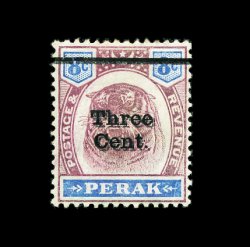 372 og imageS.G. #38, 1889 "ONE CENT PERAK" surcharge Ty. 35 on 2c Bright rose, deep intense color and impression, o.g., very fine; 1984 BPA certificate (Scott #21; $350.00). (Image) £550