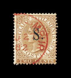 375 O imageS.G. #8, 1882 2c Brown with "S." overprint, used, fresh color, red c.d.s. postmark, two perf. tips at bottom left have been added to improve the appearance, still a fine and attractive example of this very rare stamp; 1991 BPA certificate (Scott #3; $1,400.00). (Image) £2,500