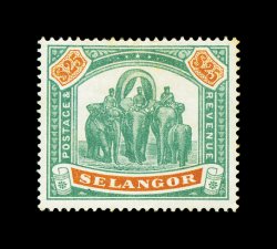 376 og imageS.G. #39, 1889 2c Bright rose, with Ty. 31 "SELANGOR" overprint, rich color, part o.g., small insignificant crease at top, still a fine example of this seldom seen stamp; 1996 BPA certificate (Scott #17; $1,100.00). (Image) £1,600