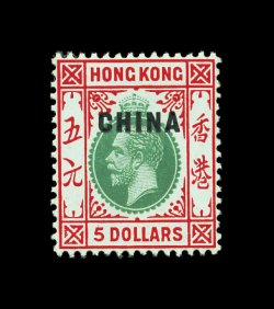 21 og imageS.G. #16, 1917 $5.00 Green and red on blue green paper, very well centered, strong colors, o.g., very lightly hinged, extremely fine (Scott #15; $300.00). (Image) £350