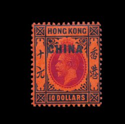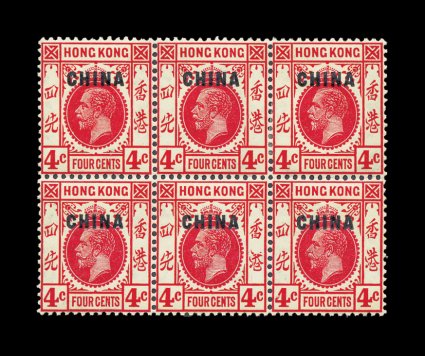 23 og/nhbl imageS.G. #20a, 1922 4c Carmine rose, lower Chinese character at right broken at top, single error contained in a block of six, the error being the middle stamp at bottom, deep rich color, o.g., error stamp n.h., a few minor perf. separations, very fine (Scott #19 var.). (Image) for hinged £170+