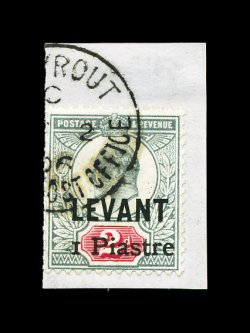 26 O imageS.G. #15, 1906 "1 Piastre" surcharge on 2p Grey green and carmine, tied to piece by proper c.d.s. postmark, very fine for this scarce stamp; 1989 BPA certificate (Scott #25; $650.00). (Image) £600