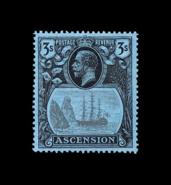 30 og imageS.G. #20a, 1924 3/- Grey black and black on blue, broken mainmast, exceptional mint example of this elusive variety, marvelously well centered, fresh with intense colors and sharp impression, o.g., lightly hinged, extremely fine (Scott #21 var.). (Image) £425