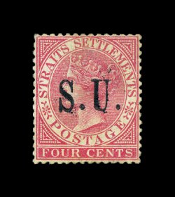 379 ng imageS.G. #14, 1882 4c Rose with "S.U." overprint, unused, well centered, deeply rich color, faint pressed out crease, otherwise very fine; an exceedingly rare stamp, and we have yet to see a genuine example without flaws; 1995 BPA certificate (Scott # 7; $1,600.00). (Image) £2,750