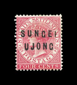 380 og imageS.G. #22, 1882 4c Rose, with "SUNGEI UJONG" overprint Ty. 12+14, brilliantly rich color, large part o.g., small thin and light horizontal crease, very fine appearance; a very scarce stamp; 1992 BPA certificate; ex-Dale-Lichtenstein (Scott #5; $800.00). (Image) £1,200