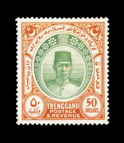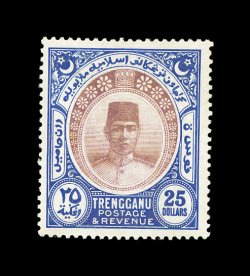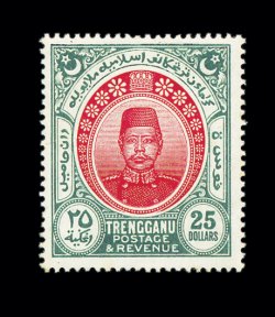 387 ogO Malaya and States comprehensive mint and used collection to 1948 on well-filled Scott pages, while lacking the rarities, the collection is loaded with better stamps cataloging £50-£250 each, plus a few high cataloging items such as Malaya 1922 $25.00 Green and orange mint (faint toning), includes elusive mint or used classics, as well as a strong showing of mint 20th century definitives, some varieties present as well, most o.g., a few small faults but the vast majority are fine-very fine; an excellent lot for a collector or dealer, as the resale value on this popular are should be quite high. Est. 3,000-4,000