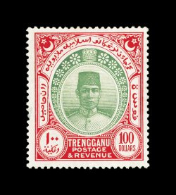 386 og imageS.G. #47, 1921 $100.00 Green and scarlet, lovely fresh colors, nicely centered, o.g., very lightly hinged, small surface scrape in left margin, otherwise a very fine example of this rare high value (Scott #41; $3,500.00). (Image) £5,000