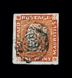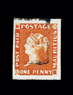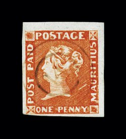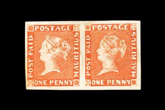 392 O imageS.G. #6, 1848 1p Vermilion on yellowish white paper, early impression, a stunning horizontal pair of incredible beauty, featuring numerous desirable features not often found on this very rare classic issue, including luxuriant brilliant color neatly complemented by the slightly yellowish paper, bordered by large to extra-large even margins, and lightly cancelled by two strikes of numeral "14" double-ring cancel, all combine to produce a pair of extraordinary appearance, virtually undetectable pressed vertical crease in right stamp that does not detract from this pair's impressive visage and otherwise extremely fine; certainly a pair that would hold a prestigious place in any major collection of the classic issues of Mauritius; signed A. Diena, W.H. C(olson) and accompanied by clear 1961 A. Diena and 1963 RPS certificates; ex-Amundsen, "Dallas" (Scott #3a; $11,500.00+). (Image) £11,000+