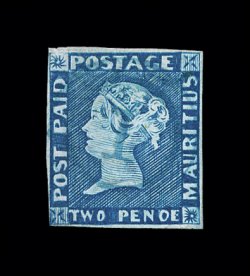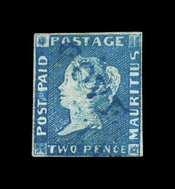 390 O imageS.G. #5, 1848 2p Deep blue on grey, earliest impression, position 3, a four-margin used single of this extremely rare earliest impression on thick paper, the impression is quite stunning and characteristic of these earliest printings with background lines so thick so as to appear nearly solid and strong shading lines across the face, marvelously intense color with blue boxed cancels, margins are large to extra large all around, thin spot at bottom right mostly in the large margins, very fine appearance; an incredibly rare stamp of this early printing and one of the more attractive of the very few in existence; 1995 BPA certificate (Scott #4; $15,750.00). (Image) £15,000