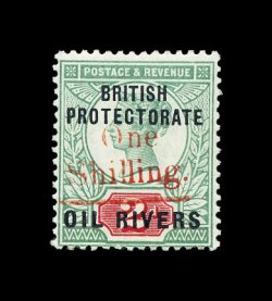 558 og imageS.G. #38, 1893 1/- on 2p Green and carmine, Ty. 11 surcharge in vermilion, mint single, quite well centered, fresh colors, o.g., very fine; 1990 BPA certificate (Scott #30, $500.00). (Image) £550