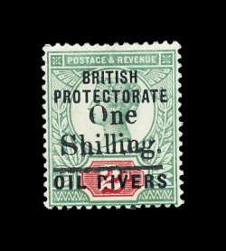 559 og imageS.G. #39, 1893 1/- on 2p Green and carmine, Ty. 11 surcharge in black, an attractive mint single of this incredibly rare stamp, wonderfully well struck and positioned example of this rare intense black surcharge, stamp is quite well centered with excellent colors, o.g. ( accompanying certificate states "foreign matter adhering but this is the red fibers from interleaving that comes on nearly all these issues and is not usually mentioned), very fine; only seventeen examples of this are known with this black surcharge; a great rarity missing from most collections; 1996 PF certificate (Scott #31; $5,500.00). (Image) £5,500