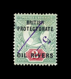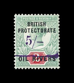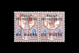562 og imageS.G. #41, 41b, 10/- on 5p Dull purple and blue, Ty. 12 surcharge in vermilion, unique se-tenant pair, left stamp vertical, reading down, right stamp upright, the premier rarity of the Neal M. Allen Collection of Niger Coast, a lovely pair in marvelous condition with numerous exceptional physical characteristics, possessing beautiful centering which is only infrequently found on these issues, plus deep radiant colors and both surcharges perfectly struck with razor sharp impressions, o.g., extremely fine; Nicholson notes that there was a total of only 32 of the Ten Shilling surcharged values printed, this included five varieties showing different orientations of the surcharge, the left stamp in this pair is the only known example of the surcharge vertical reading down, thus this se-tenant pair is unique as well, a stellar piece for an award-winning collection of Niger Coast; 1991 BPA certificate; ex-Crocker, Dale-Lichtenstein (Scott #33, 33 var.). (Image) £21,000+