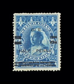 563 og imageS.G. #65b, 1894 1/2p on 2 1/2p Blue, "Oie" for "One", mint single, quite well centered, fresh color, o.g., tiny thin speck, otherwise very fine; this variety occurred because of broken type in one position part way through the production, total quanities of this variety are estimated at about 80 stamps with most being used; this variety not listed in Scott (Scott #54 var.). (Image) £1,500