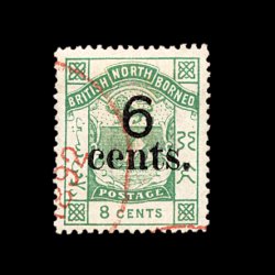 568 O imageS.G. #54, 1892 "6 cents." surcharge on 8c Green issue of 1896, a most impressive used example of this very rare stamp, well centered, lovely rich color, red c.d.s. postmark, very fine; one of the key rarities of North Borneo; 1957 BPA certificate (Scott #54; $4,500.00). (Image) £4,000