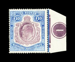 575 nh imageS.G. #82, 1908 £10 Purple and ultramarine, a select right sheet-margin single with purple plate no. 1, an unusually fresh example of this rare high value, the colors are vastly superior to those found on the great majority of this stamp with very little of the rubbing that is endemic to this issue, full clean original gum that is never hinged, very fine; signed A. D(iena) and accompanied by his 1969 certificate, as well as a 1998 BPA certificate (Scott #11; $8,500.00). (Image) £7,000