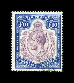 576 O imageS.G. #99e, 1919 £10 Purple and royal blue, used single of this very scarce high value with portion of c.d.s. pmk., wonderfully deep colors on bright white paper, very fine ; 1984 PF of Southern Africa certificate (Scott #24; $2,000.00). (Image) £1,700