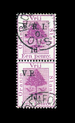 577 O imageS.G. #102, 102g, 1900 "V.R.I./1d" surcharge Ty. 31 on 1p Purple, "I" and period after "R" omitted, bottom stamp in used vertical pair with normal, the variety stamp also shows "V" and "R" close together, certificate notes that this is the second stage of the variety, fresh and well centered example of this striking variety, neatly cancelled, very fine; 1992 BPA certificate (Scott #45, 45b; $175.00+). (Image) £300+