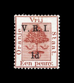 578 og imageS.G. #102a, 1900 "V.R.I./1d" surcharge Ty. 31 on 1p Brown, error of color, attractive and quite well centered example of this error being printed on the first color of this value, rich red brown color on bright white paper, o.g., h.r., certificate mentions crease which is no more than a mild horiz. gum bend, otherwise very fine and scarce; 1949 BPA certificate (Scott #45O; $675.00). (Image) £600