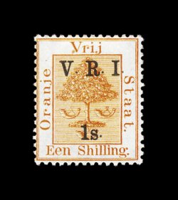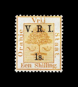 579 og imageS.G. #110a, 1900 "V.R.I./1s" surcharge Ty. 31 on 1/- Orange yellow, error of color, a rarely seen mint example of this rare color error printed on the early color of the 1/- stamp, brilliant color and unusually well centered for this, light diagonal crease at top right that does not detract from this rarity's attractive appearance, otherwise very fine; only a very few mint examples of this error are known; 1993 BPA certificate (Scott #52G; $3,000.00). (Image) £3,250