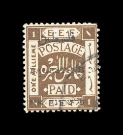 587 O imageS.G. #58, 1921 1m Sepia, perf. 14, used, fresh color, lightly cancalled, very fine; an exceptionally rare stamp, with only one sheet of 240 having been printed, but only a tiny fraction of these still exist, and nearly all of which are used; 1967 RPS certificate (Scott #15f; $2,500.00). (Image) £2,000