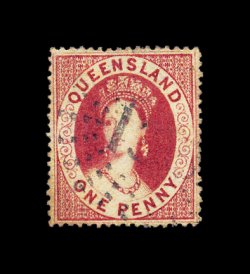 592 O imageS.G. #4, 1860 1p Carmine rose, clean cut perf., watermark large star, an especially choice used single, possessing exceptional centering within large margins which is most uncharacteristic of this issue, rich color, extremely fine; 1992 BPA certificate (Scott #4; $240.00). (Image) £250