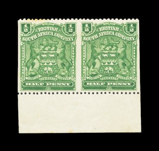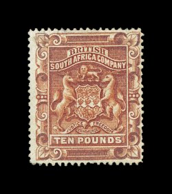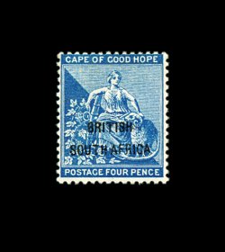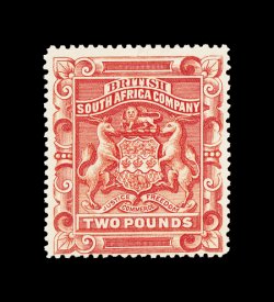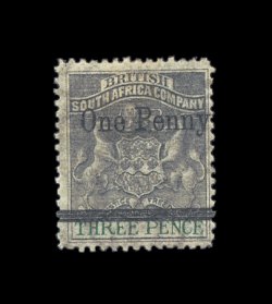 595 og imageS.G. #62a, 1896 4p Blue with "British/South Africa/Company" overprint, "Company" omitted, an extremely rare overprint error of which only sixteen examples have been recorded (one of which is in the Royal collection), mint single with clear deep color, centered to the top as nearly all are found, part o.g., light vertical crease, otherwise fine; a very desirable example of this striking error; example number five from the exhaustive census compiled by the highly regarded Rhodesian specialist Colin Hoffman (London Philatelist, Vol 95, 1986), this error being described by Mr. Hoffman as the rarest of the Rhodesian varieties; clear 1975 RPS certificate (Scott #46a; $9,000.00). (Image) £8,000