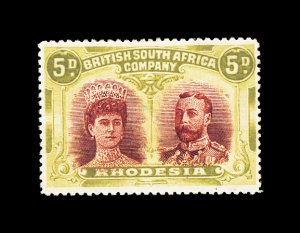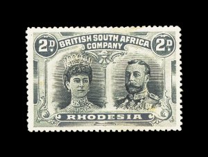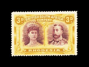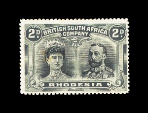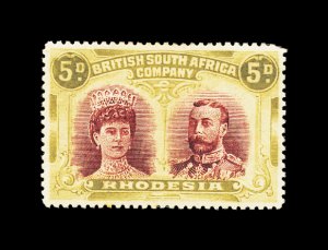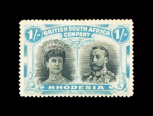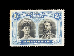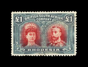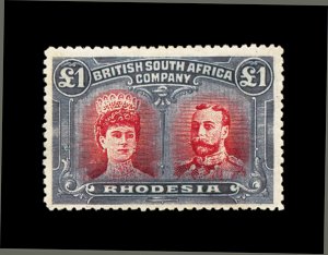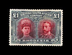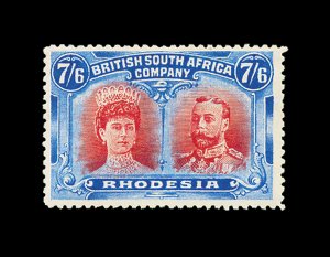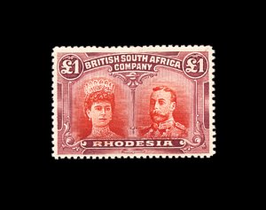627 og imageS.G. #166b, 1910 £1 Scarlet and reddish mauve, error of color, a lovely fresh mint example, possessing luxuriant colors and crisp impressions, especially well centered for this within large margins, full fresh o.g. that is very lightly hinged, an extremely fine example of this rarity; only 100 were discovered among the post office remainders; one of the major rarities of Rhodesia and a key to a specialized collection or exhibit of "Double Heads", this copy being among the finest available; 1979 Nussbaum certificate (Scott #118 var.). (Image) £9,000