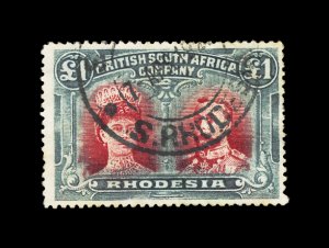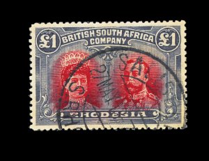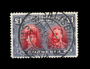 625 O imageS.G. #166, 1910 £1 Rose scarlet and bluish black, handsome used single with central Salisbury c.d.s., exceptionally deep rich colors and very well centered, extremely fine (Scott #118a; $325.00). (Image) £350