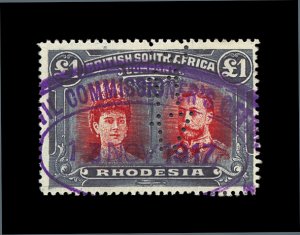636 O imageS.G. #179, 1910 £1 Red and black, perforated 15, attractive fiscally used single which was the normal usage for this high value, central "Civil Commissioner's Office/13 Nov 1917" violet oval cancel with matching perf. initial date, fresh with intense deep colors, very fine and a very rare stamp in this perforation; ex-Gibbs (Scott #118c). (Image) Est. 200-300