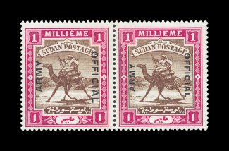 720 og imageS.G. #A4c, 1905 Small "Army Official" overprint Ty.A2 on 1m Brown and carmine, wmk. quatrefoil, se-tenant pair with large overprint Ty. A1, a magnificent mint horizontal pair containing the very rare small overprint, which is a terribly elusive stamp with this watermark in its own right, wonderfully fresh with luxuriant bright colors on fresh white paper, beautifully centered, fresh o.g., lightly hinged, extremely fine; the small overprint rarely makes its appearance as a single and is almost impossible to acquire in such a premium pair as this; signed Friedl and H. Bloch, as well as being accompanied by 1950 Friedl and 1995 BPA certificates (Scott #MO1, 2). (Image) £2,500+