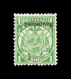 723 og imageS.G. #3a, 1889 "Swazieland" overprint on 1/- Green, inverted overprint, well centered mint single, fresh bright color, o.g., h.r. which accompanying certificate states causes creases, we find any creasing that may be there to be extremely minimal, otherwise very fine: 1991 BPA certificate (Scott #5a; $600.00). (Image) £600