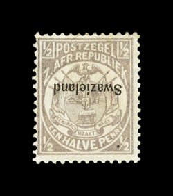 724 og imageS.G. #4a, 1889 "Swazieland" overprint on 1/2p Grey, inverted overprint, mint single of this variety that is scarcer with black overprint, o.g. under rather large h.r., small thin, otherwise nearly very fine; 1991 BPA certificate (Scott #1a; $725.00). (Image) £800