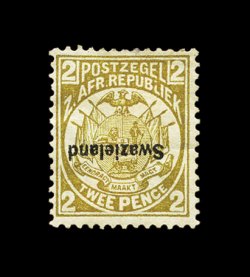 725 og imageS.G. #5a, 1889 "Swazieland" overprint on 2p Olive bistre, perf. 12 1/2, inverted overprint, mint single with intense bright color, o.g. with large h.r. causing minor crease, tiny thin speck at top, nearly very fine centering and scarce variety; 1991 BPA certificate (Scott #3a; $725.00). (Image) £700