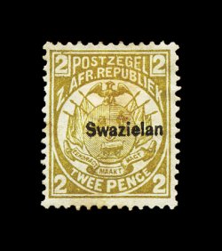 726 og imageS.G. #5b, 1889 "Swazieland" overprint on 2p Olive Bistre, perf. 12 1/2, "d" of "Swazieland" omitted, position 51, mint example of this popular variety, quite well centered, bright color though faint central toning, o.g., h.r., very fine; this variety is found in the left bottom corner position of each sheet on only some printings; clear 1991 BPA certificate (Scott #3b; $475.00). (Image) £475