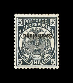 727 og imageS.G. #8a, 1890 "Swazieland" overprint on 5/- Slate blue, overprint inverted, overprint position 14 inverted on stamp position 47 showing broken right leg of "w", a well centered single, possessing particularly intense deep color on fresh white paper, o.g., h.r., trivial margin tear at top, otherwise very fine and an attractive example of this very scarce variety; clear 1991 BPA certificate (Scott #7a; $1,750.00). (Image) £1,600