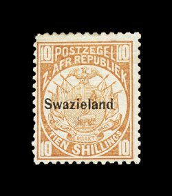 728 og imageS.G. #9, 1889 "Swazieland" overprint on 10/- Fawn, a fresh mint example of this rare high value, centered to the left as most are, but clear of the design and better centered than most, clear bright color, o.g., small thins and a couple faint gum creases at left, very fine appearance: the rarest regularly issued stamp of this country with only a tiny number printed; 1990 BPA certificate (Scott #8; $5,000.00). (Image) £4,500