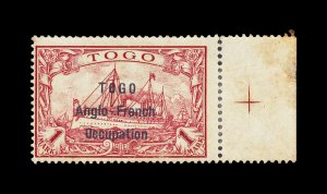 733 og imageS.G. #H10, 1914 "TOGO/Anglo-French Occupation" overprint on 1M Carmine, wide setting, right sheet-margin mint single with guide lines in the selvage, position 12, strong color, light overall aging to the paper, accompanying certificate mentions staining which is largely toning in the selvage, stamp is fine and rare; only about 100 stamps of this value were issued in this setting and the majority of those were used, making mint examples decidedly elusive in any condition; 1979 APS certificate (Scott #44; $5,000.00). (Image) £5,000